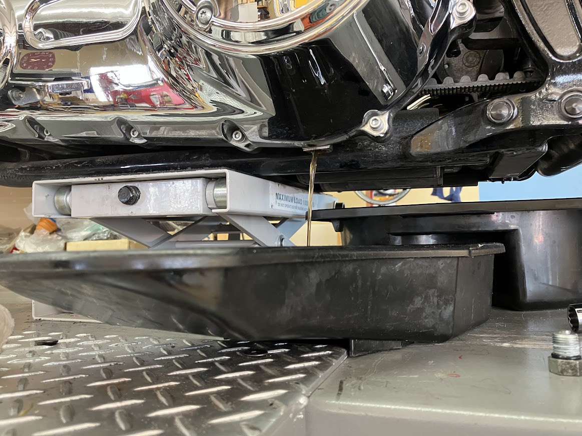 ハーレーのオイル交換では、リフトに乗せる前にしばらくエンジンをかけて熱くしておく必要があります。